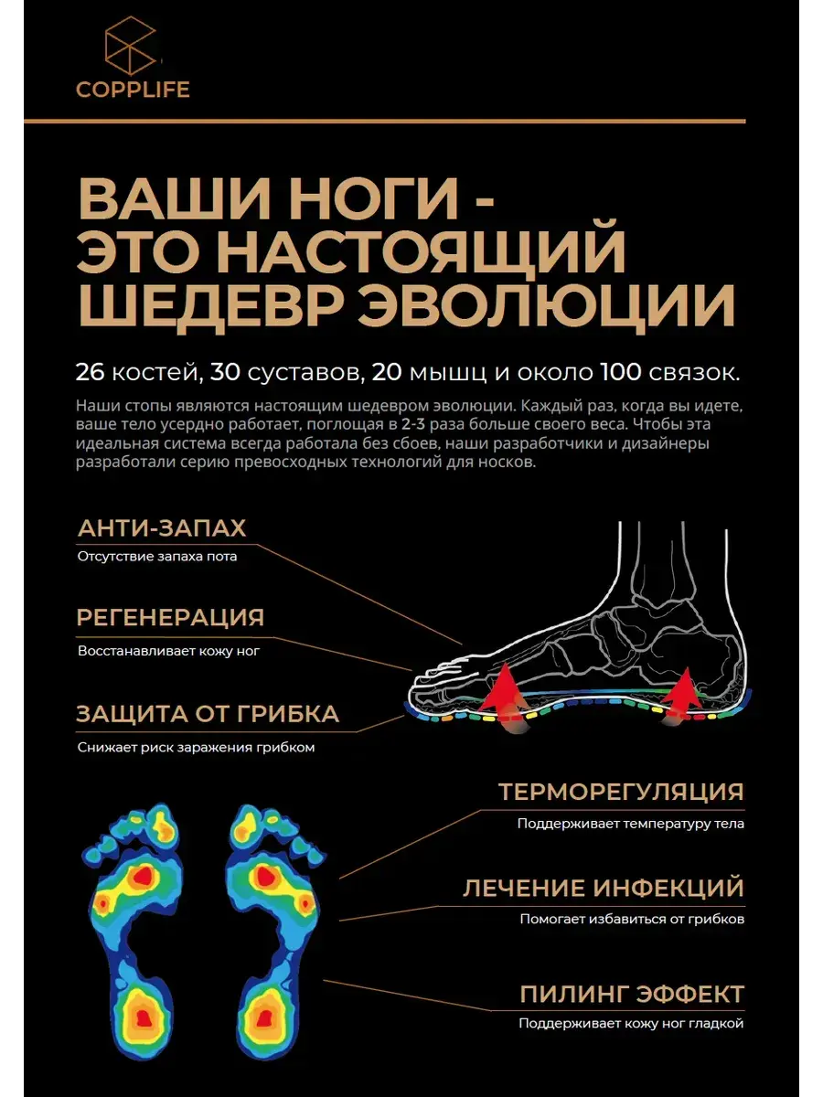 Добавление наночастиц меди COPPLIFE способствует улучшению кровообращения и предотвращению развития микробов, делая их особенно подходящими для длительных тренировок и бега. Носки имеют декоративные полоски, что добавляет им элегантности и стиля. Они подходят не только для спортивных мероприятий, но и для повседневного ношения, а также могут быть использованы в роддомах для поддержки ног мам после родов.